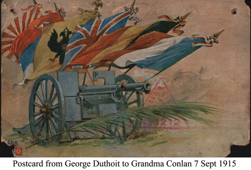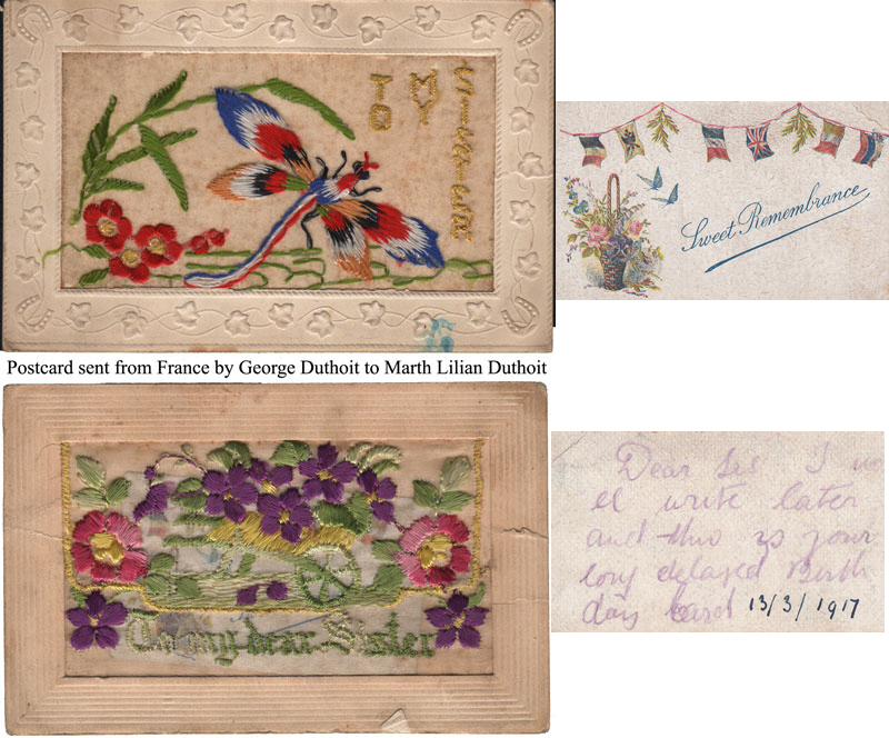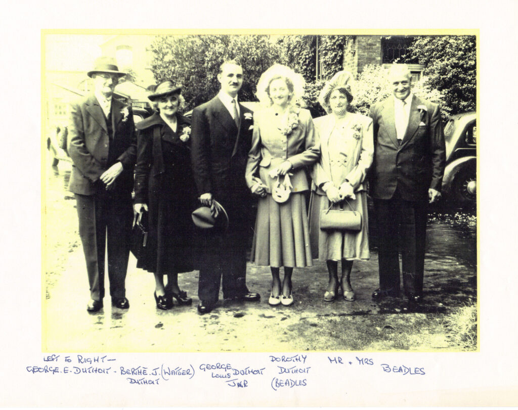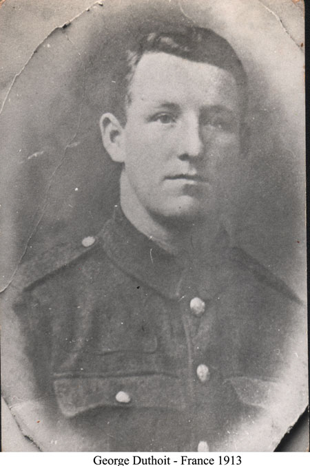 Duthoit Ada Thompson & Martha Lilian DuthoitGeorge Duthoit & Dorothy Beadles WeddingGeorge Edgar Duthoit; Berthe Josephine (Wattier) Duthoit; George Louis Duthoit Jnr; Dorothy (Beadles) Duthoit; Mr & Mrs BeadlesGeorge Duthoit Born: 1898Died: 1918George Duthoit Grave - 1918Official photo taken after the warGeorge Louis DuthoitGeorge Louis Duthoit 1902 - aged 18George Duthoit 1901 - aged 3George Duthoit - France 1913George Louis DuthoitGeorge Louis DuthoitJohn William DuthoitBorn: 21 July 1858 - Hunslet, LeedsMartha Lilian Duthoit & (unknown)George Duthoit Name stated as George ThompsonRoyal Field Artillery13th October 1918 age 21FrancePostcard from George Duthoit - 7 September 1915Postcard sent from George Duthoit to his mother Elizabeth Conlan-Thompson-Duthoit-ThompsonGrandma BedfordMother of George Louis DuthoitOn reverse:From Grandma Bedford, with loveTo Mr Duthoit, my GrandchildGrandma BedfordMother of George Louis DuthoitPostcards from George Duthoit Sent from France to Martha Lilian Small card reads, this card is enclosed in the bottom postcard by a flap: Dear Sis, I will write later and this is your long delayed birthday card.Martha Lilian dated i as 13/3/1917Jim Duthoit 1928 TexasBottom in shirt sleevesBrother to Martha LilianMartha Lilian and brother Jim DuthoitAt Tony's 21st - 1961Mary Ellen Duthoit - born 1861Sister to John William DuthoitFather: George DuthoitMother: Emma PittsThomas Ledsham WilkinsonMarried to Elizabeth Woodward (born 1851)Father: James WoodwardMother: Elizabeth Woodward